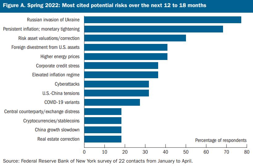 이번 봄 설문에서는 러시아의 우크라이나 침공이 1순위 위험 요소로 떠올랐다. 응답자 80%가 러우 전쟁 위기에 대한 우려를 표하면서, 지난 가을 설문에서 가장 높은 순위에 올랐던 '지속적인 인플레이션·통화긴축'을 밀어냈다.