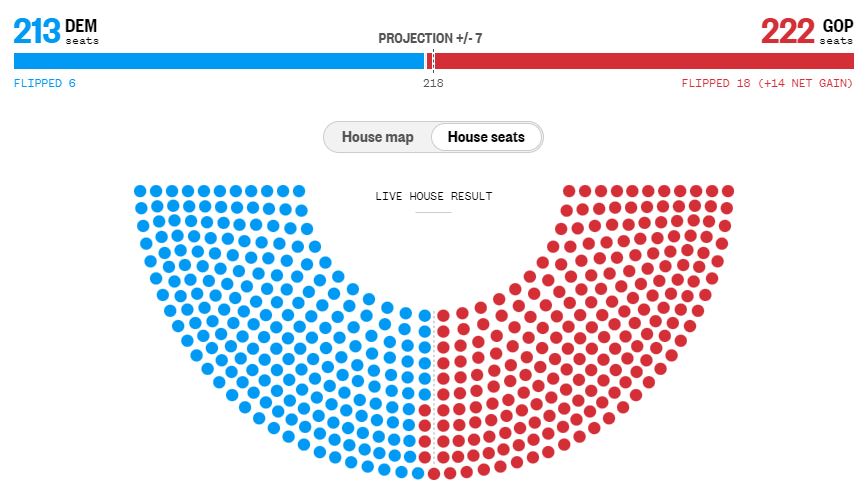 이번 중간 선거는 상원 100석 중 35석, 하원 전체 435석, 주지사 50명 중 36명을 선출했다. NBC뉴스에 따르면 하원 선거에서 공화당이 과반인 218석을 넘는 222석을 확보했다. 213석을 얻은 민주당을 근소한 차이로 앞섰다.