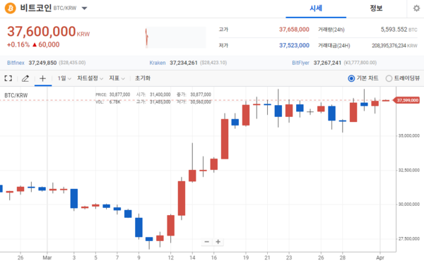 가상자산 거래소 업비트에 따르면 1일 오전 9시 기준 비트코인은 전월 동시간 대비 21.1% 상승한 개당 3752만8000원에 거래됐다. 한달만에 700만원 이상 상승한 모습이다. 앞서 비트코인은 지난달 초 크립토 친화적인 미국 소재 은행 실버게이트가 파산하면서 2700만원대로 밀린 바 있다.