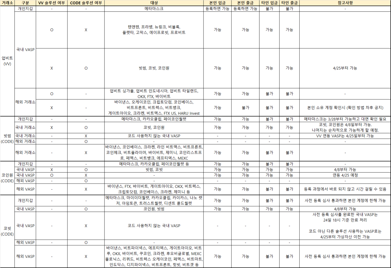 코드를 사용하는 코인원·빗썸과 코빗 간 입출금은 4월8일부터 본인 계정과 타인 계정 여부와 상관없이 가능하다. 코드를 사용하지 않는 국내 VASP 중 사전 등록 심사를 완료한 국내 VASP는 3월24일 18시 기준으로 만료처리됐다. VV 솔루션 쓰는 국내 거래소 이용자는 4월25일부터 가상자산 이전이 가능하다.