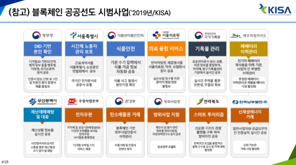 현재, 각 정부부처들은 블록체인 공공선도 시범사업을 전개하고 있다. 병무청의 분산ID(DID) 기반 본인확인 사업, 환경부의 탄소배출권 거래 사업, 우정사업본부의 모바일 전자우편 등이 대표적이다.