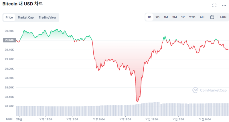 27일 토큰포스트마켓에 따르면 비트코인은 8시 50분 기준 전날 대비 0.77% 하락한 2만9381 달러(약 3506만원)에 거래되고 있다.