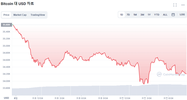 9일 토큰포스트마켓에 따르면 비트코인은 8시 40분 기준 전날 대비 4.43% 하락한 3만4114 달러(약 4071만원)을 기록했다.