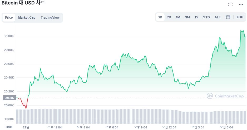 23일 토큰포스트마켓에 따르면 비트코인은 8시 3분 기준 전날 대비 4.31% 상승한 2만 1010달러(약 2733만원)에 거래되고 있다.