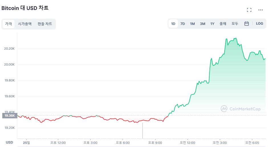 전날 암호화폐 시장이 급반등했다. 비트코인은 약 3주 만에 2만 달러를 재돌파했다. 한때 2만300달러까지 올랐다가 현재도 2만 달러를 상회하고 있다.