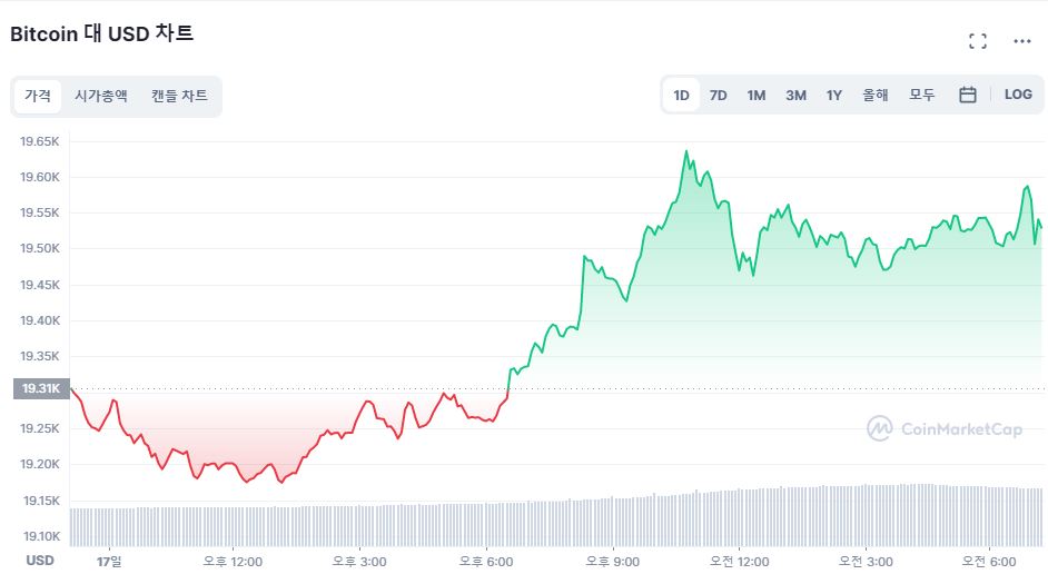 큰 반등 움직임을 보인 증시와 달리, 암호화폐 시장은 상승세는 완만하다. 비트코인은 소폭 상승했지만 1만9000달러대를 벗어나지 못하고 있다.