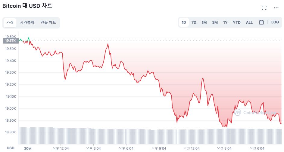 21일 오전 8시 20분 기준 토큰포스트마켓에 따르면 비트코인은 전날 대비 3.53% 하락한 1만8881달러(약 2617만원)에 거래되고 있다.