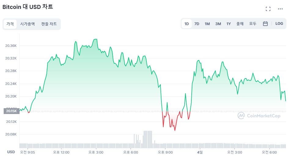 3일 오전 8시 20분 기준 토큰포스트마켓에 따르면 비트코인은 전날 대비 0.32% 상승한 2만200달러(한화 약 2884만원)에 거래되고 있다.