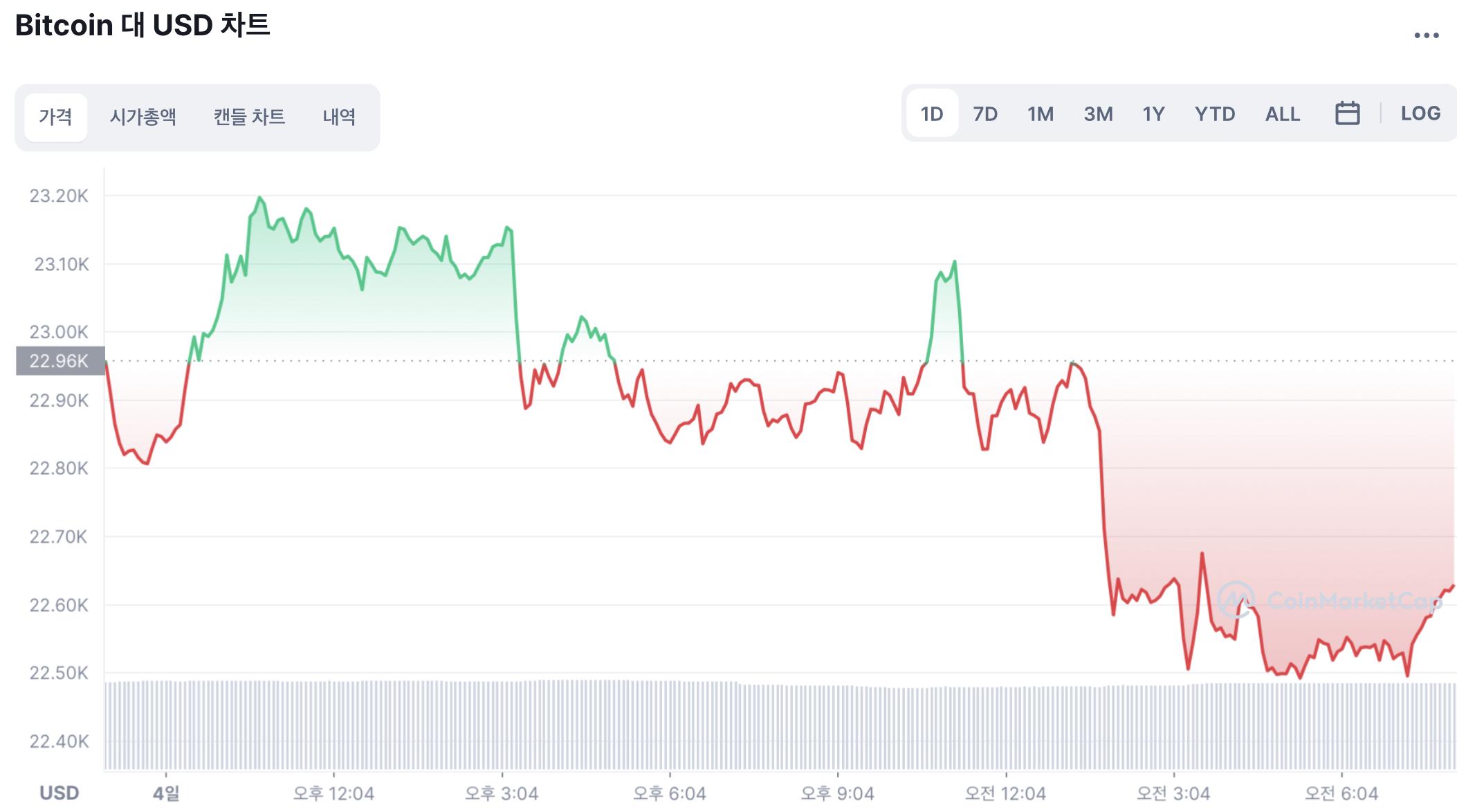 5일 토큰포스트마켓에 따르면 비트코인은 오전 8시 기준 전날 대비 1.59% 하락한 2만2623달러(약 2964만원)에 거래되고 있다.