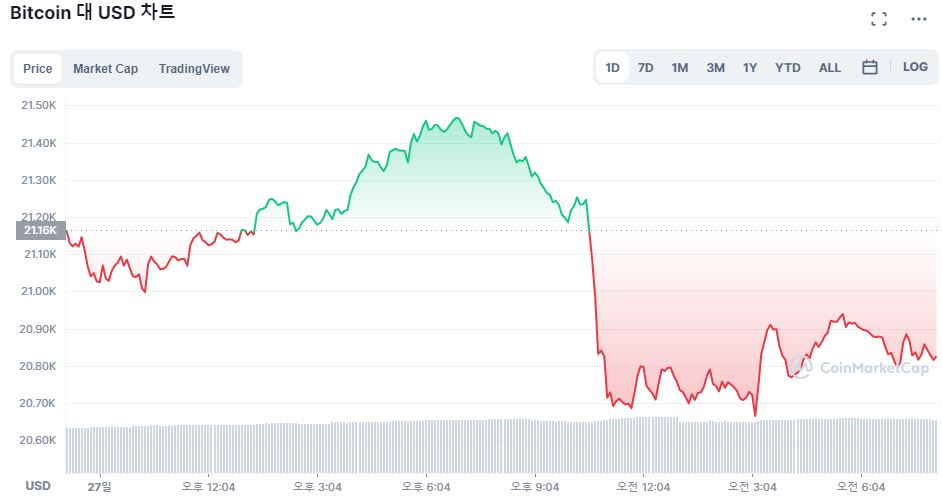 미국 증시가 하락하면서 비트코인 2만1000달러선이 다시 무너졌다. 암호화폐 시장 전반이 소폭 하락하고 있다.