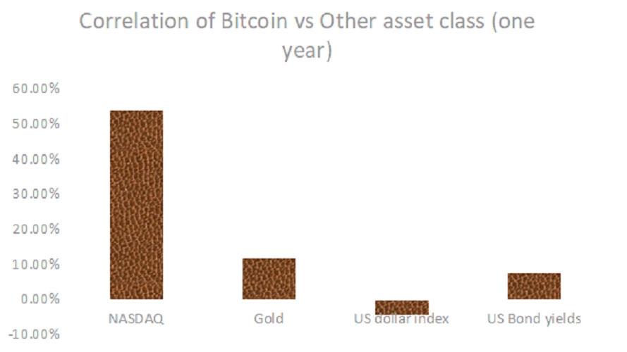 지난 23일(현지시간) 외환 투자분석업체 FxWirePro에 따르면 지난 1년 동안 비트코인은 나스닥과 높은 양의 상관관계를 가진 것으로 확인됐다. 두 자산의 상관관계는 지난 2월부터 4월 사이 더욱 강화됐다. 금과는 약한 양의 상관관계를 보였으며, 미 달러, 미 국채 10년물 금리와는 거의 상관관계를 갖지 않은 것으로 나타났다.
