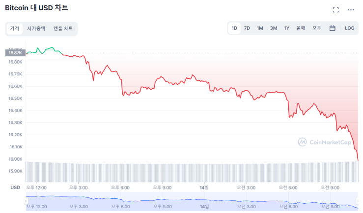 11일 오전 11시 20분 기준 토큰포스트마켓에 따르면 비트코인은 전날 대비 5.04% 하락한 1만6028달러(한화 약 2106만원)에 거래되고 있다.