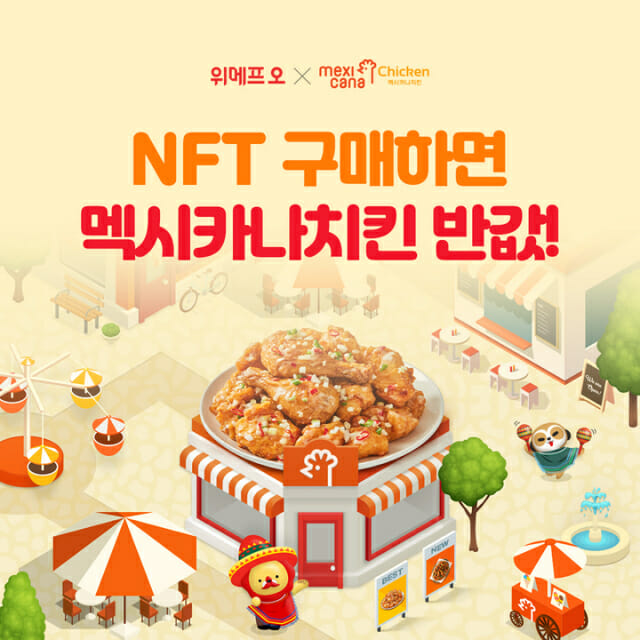 멕시카나치킨 NFT는 멕시카나치킨의 신제품 출시를 기념해 위메프오와 협업해 총 500개가 발행되며, 위메프오 공식 캐릭터 오사장과 포미가 멕시카나치킨 마을에 방문하는 모습을 표현했다.