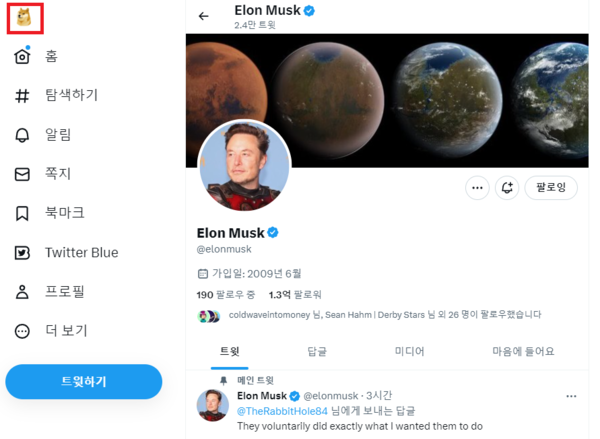 또 4일 오전 4시 44분경에는 '약속대로(As promised)'라는 트윗과 함께 트위터의 새 로고를 도지코인 마스코트로 바꾸라는 내용의 글을 트윗했다.