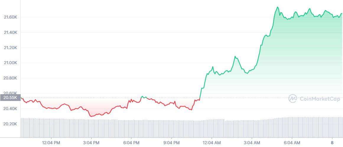 BTC(비트코인)는 일주일 만에 처음으로 2만1000달러를 돌파, 하루 사이 7% 이상 상승했다.