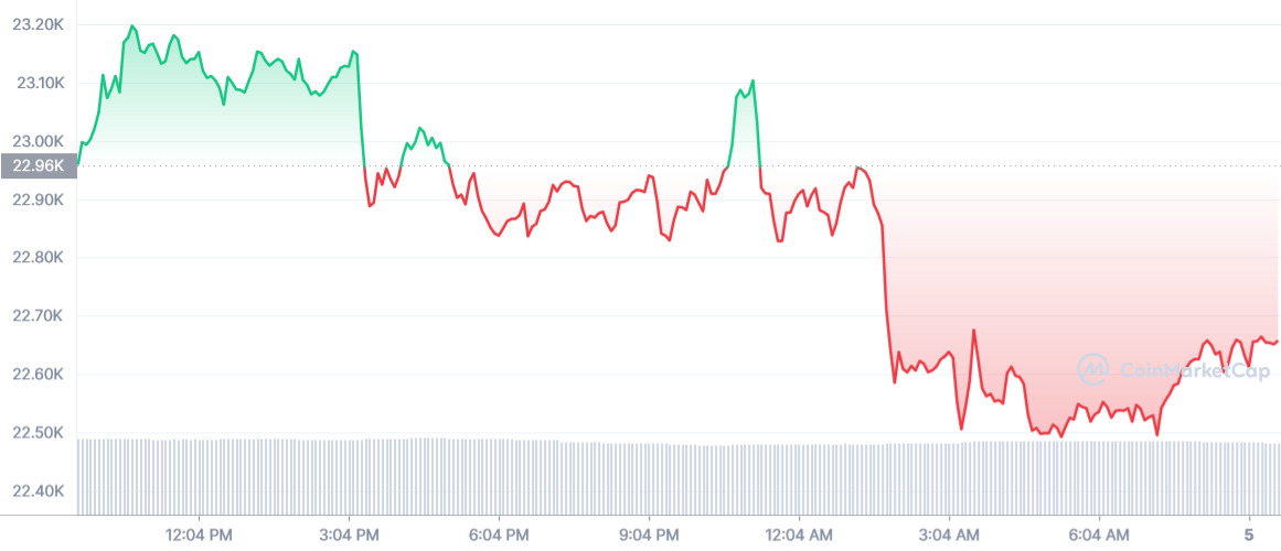 BTC(비트코인)는 전날 4% 하락하며 5일(현지시간) 오전 9시 기준 2만3000달러 아래로 떨어졌다. 어제 시황 기사에서 언급한 추세선을 테스트하고 있는 것으로 보인다.
