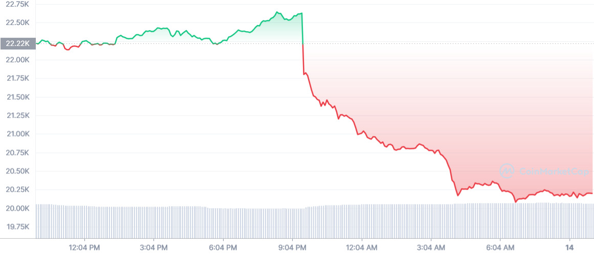 BTC(비트코인) 가격은 CPI 발표 직후 하락해 한국시간 기준 14일 밤 9시 기준 5% 떨어졌다. 이로써 최근 9% 상승분을 모두 반납하며 2만1000달러 아래로 다시 떨어졌다. 거래량은 비교적 탄탄한 모습이었다. 20일 평균 거래량의 약 7배를 기록했다.