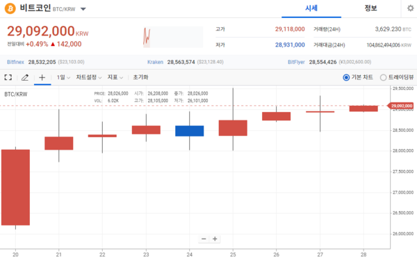 가상자산 거래소 업비트에 따르면 28일 오전 9시 기준 비트코인은 전주 동시간 대비 3.57% 상승한 개당 2902만8000원에 거래됐다. 비트코인 상승세는 지난 20일부터 시작됐다. 이후 설연휴간 상승세를 이어간 비트코인 가격이 결국 2900만원대를 돌파한 모습이다.