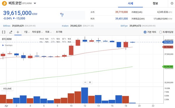 가상자산 거래소 업비트에 따르면 19일 오전 9시 기준 비트코인은 전일 동시간 대비 2.47% 상승한 3964만3000원에 거래됐다.