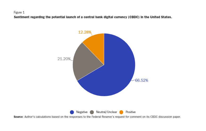 27일(현지시간) 미국 보수 성향 싱크탱크 '카토연구소'의 정책 애널리스트 니콜라스 안토니는 디지털 달러에 관한 의견서 2052건을 확인한 결과, 66%가 디지털 달러에 대해 우려를 표하거나 완전히 반대했다고 밝혔다.