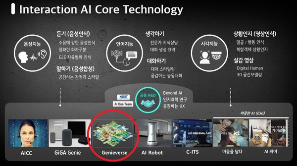 KT는 지난 19일 서울 서초구 KT 융합기술원에서 AI 전략을 발표하면서 '지니버스'를 최초로 공개했다. 이날 행사에 참여한 배순민 KT 융합기술원 AI2XL 연구소장은 '지니버스'라는 메타버스 서비스를 개발하고 있다며 "홈 서비스를 중심으로 생활에 밀접한 메타버스를 만들고 있으며 당연히 AI 기술이 다양하게 활용될 것"이라고 설명했다.